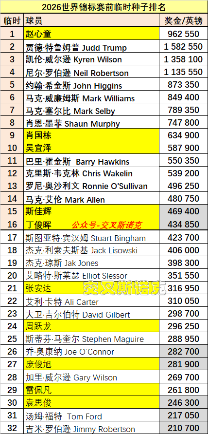 卫冕冠军赵心童是一号种子。目前临时排名前16的球员,斯佳辉和丁俊晖,只能坐等,成为后续球员追赶的固定目标,只不过斯佳辉跌出前16的概率较小,重点是丁俊晖。