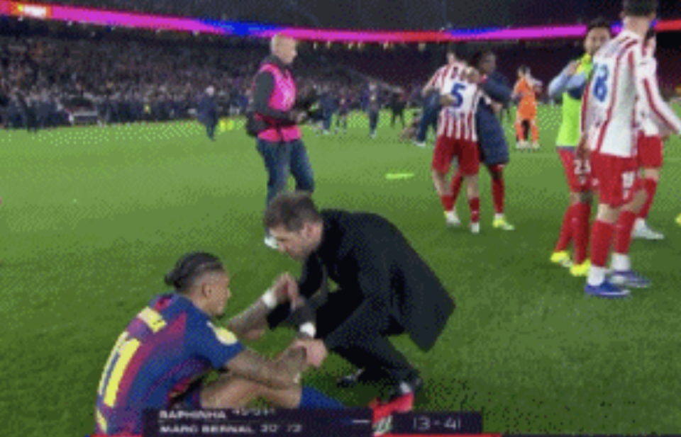 比赛结束后,巴萨和马竞的多名球员都瘫倒在地,他们都快燃尽了,体能接近极限。此时,死里逃生的“匪帅”西蒙尼一脸惊魂未定,他缓缓走入球场。他主动上前安慰倒在地上的拉菲尼亚,向对手表示致敬。